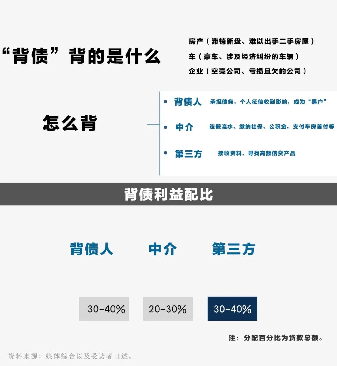 在分成比例中,背债人一般拿30—40%,中介20—30%,第三方30—40%。