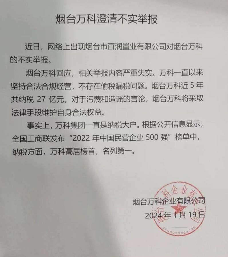 1月20日,《每日经济新闻》记者获悉,烟台万科发布澄清说明,网络上近日出现烟台市百润置业对烟台万科的不实举报,内容严重失实。万科一直以来坚持合法合规经营,不存在偷税漏税问题。烟台万科近5年共纳税27亿元。对于污蔑和造谣的言论,烟台万科将采取法律手段维护自身合法权益。